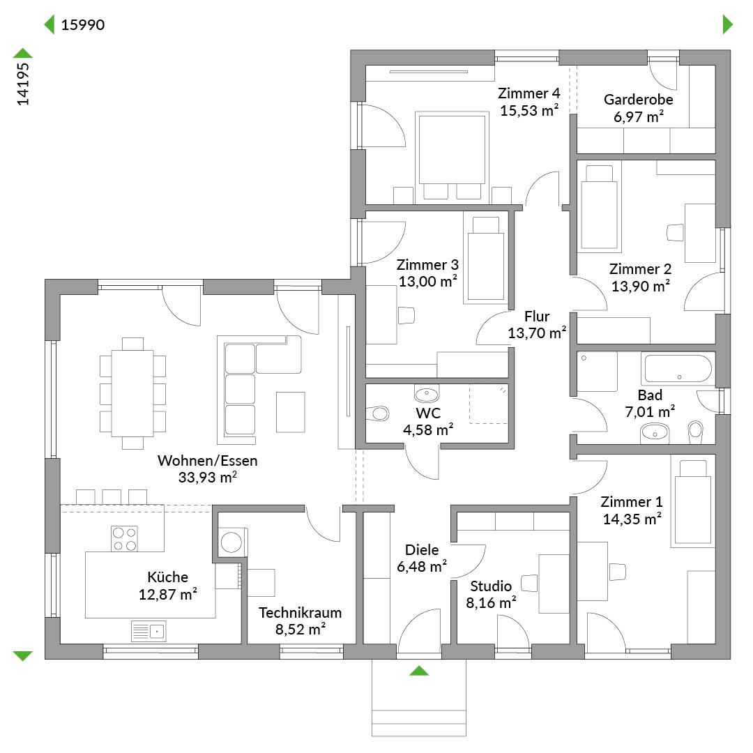 Alles im Blick und alle zusammen… Unser größter Bungalow Family 159 in L-Form überzeugt mit stattlichen Maßen. Hier bleibt man bis ins hohe Alter unabhängig, auch wenn die Kinder längst aus dem Haus sind. Hier lebt es auch mit mehreren Generationen perfekt zusammen. Denn der offene Familienbereich mit Wohn- und Esszimmer sowie die offene Küche wurden so platziert, dass sie von Schlaf- und Ruheräumen getrennt ist. Vom kommunikativen Zentrum des Hauses ist auch die windgeschützte Terrasse begehbar, die förmlich zu einem Glas Rotwein bei Sonnenuntergang einlädt. Arbeitszimmer, vier Schlafzimmer, zwei Bäder – beim Wohnkomfort mangelt es hier an nichts.