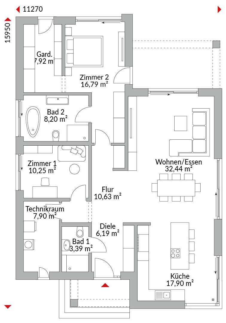Winkelbungalow mit Eingangsüberdachung der höheren Haustür und zwei Schlafzimmern. Hauptschlafzimmer mit begehbarer Ankleide. Bad mit freistehender Badewanne, Doppelwaschbecken und Dusche. Das erhöhte Wohngeschoss mit eckverglastem Eckerker und höheren Fenstern ist als offene Küche / Wohnen/ Essen mit Schiebetüren zur Terrasse konzipiert. Gäste-WC, Technikraum und Diele, Flur. Walmdach mit breiter Traufe von 60 cm und 25° Dachneigung inklusive Terrassen- und Eingangsüberdachung.