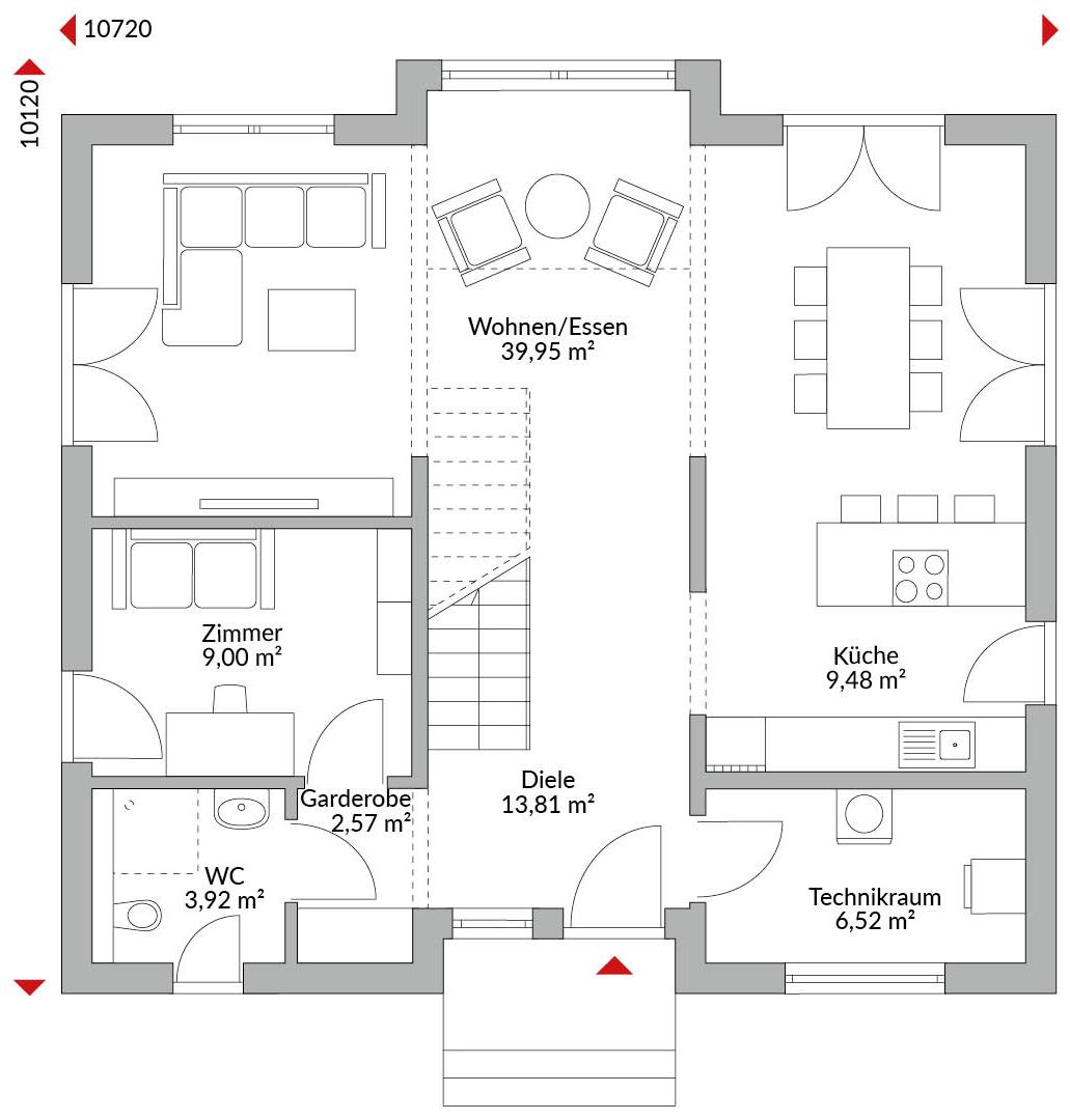 Eineinhalbgeschossiges Haus mit 5 Zimmern, Ankleide, offener Küche, Bad, Gäste-WC, Diele, Flur, Garderobe und Technikraum. Satteldach mit 30° Dachneigung. Kniestock 1,75 m.