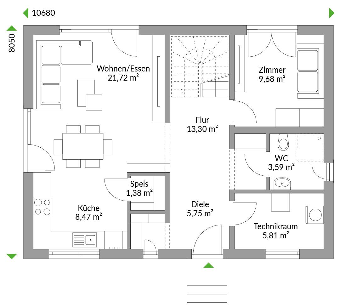 Dieses Familienhaus ist schon von außen ein echter Hingucker. Bodentiefe, sprossengeteilte Fenster versprühen Landhauscharme – und dies ohne zusätzliche Kosten – und zeigen: Hier geht es gemütlich zu. Ein zusätzlicher AHA-Effekt offenbart sich auch im Innern. Hier ist nichts konventionell - dank ungewöhnlicher architektonischer Details. Da wäre der Eingang an der Traufwand des Gebäudes, der einen großzügigen Dielen- und Flurbereich ermöglicht. Wohn- und Essbereich nehmen so eine „Haushälfte“ ein. Ein zusätzliches Arbeitszimmer konnte dank rückwärtiger Lage neben der Treppe als Rückzugsmöglichkeit platziert werden. Drei Schlafzimmer, Ankleide und Wannenbad vervollständigen das Obergeschoss und bieten ruhige Plätze zum Relaxen und Erholen. Auch hier lässt sich optional mit einer Kniestockerhöhung im Obergeschoss Raumgewinn erzielen.