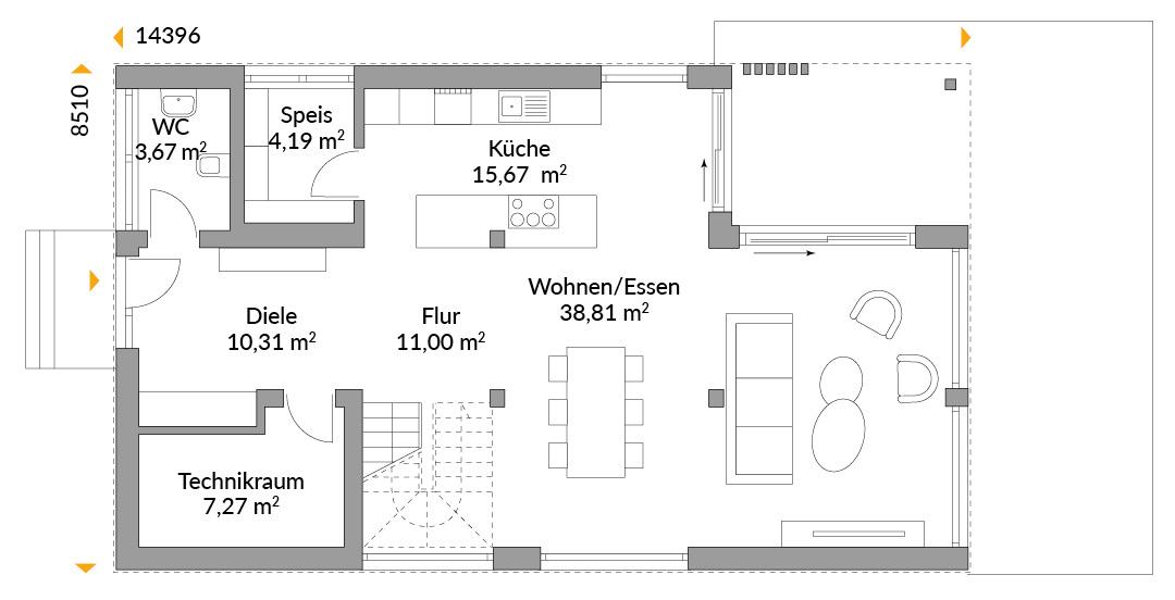 Schmal und schick und mit tollen Highlights auf der Gartenseite - dieses Modulhaus besticht mit überzeugendem Design. Neben den großen Glasflächen bestimmen interessante Architekturdetails das Besondere dieses modernen Familienhauses. Der hervorgezogene, wintergartenartige Teil des Erdgeschosses ermöglicht großzügiges Wohnen in der offenen, gut zonierten unteren Ebene und bietet eine geschützte Terrasse. Die obere Etage öffnet sich bis unter den First, beeindruckt mit drei geräumigen Schlafzimmern und einer luxuriösen Wellnessoase.