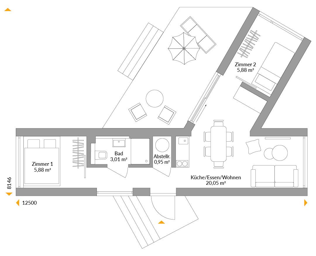 Schön, wenn das Ferienhaus Flügel bekommt. Denn da passt noch ein zweites Schlafzimmer hinein. Und ein zusätzlicher großer Schrank. Für vier Personen – oder maximal sogar sechs – braucht es ein bisschen mehr Stauraum. Und es gibt trotz der schmalen S-Module Platz für einen großen Tisch, an dem in geselliger Runde gegessen und gespielt werden kann. Das angedockte Modul sorgt außerdem für einen windgeschützten Terrassenplatz, der an warmen Tagen als Sommerzimmer eine feste Größe ist.