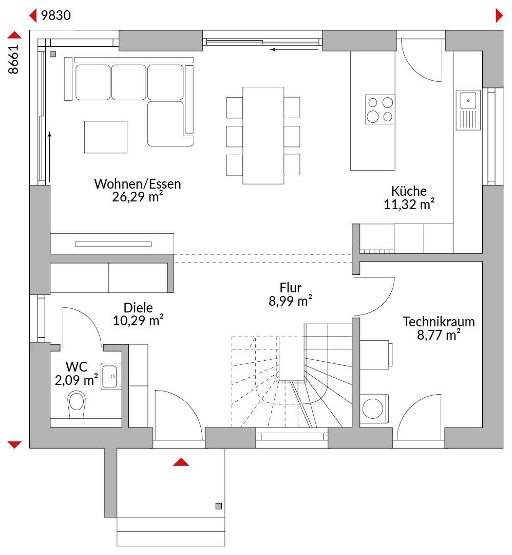Zweigeschossiges Haus mit Eingangsüberdachung der höheren Haustür und zwei Zimmern und separater Garderobe im Obergeschoss. Wannenbad mit Dusche und Doppelwaschbecken. Das erhöhte Erdgeschoss mit Eckverglasung und höheren Fenstern ist als offene Küche/ Wohnen/ Essen mit Schiebetüren zur Terrasse konzipiert. Gäste-WC , Technikraum und Diele, Flur, Zeltdach mit breiter Traufe von 60 cm und 22° Dachneigung.