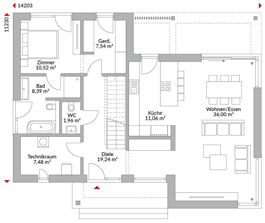 Zweigeschossiges Haus mit Eingangsüberdachung der höheren Haustür und mit zwei Zimmern und Studio im Obergeschoss. Beide Schlafzimmer mit begehbarer Ankleide. Bodentiefe Verglasung, geräumiger Flur mit Loungebereich, Wannenbad mit Dusche und Doppelwaschbecken, und angeschlossenem Abstellraum für Waschmaschine und Trockner. Gästezimmer im Erdgeschoss mit eigenem Wannenbad en Suite. Gäste-WC. Das höhere Erdgeschoss mit erhöhter Eckverglasung ist als offene Küche mit Eckfensterlösung/ Wohnen/ Essen mit Schiebetüren zur Terrasse konzipiert. Speisekammer, Technikraum und Diele mit Garderobe, Walmdach mit breiter Traufe von 60 cm, Walmdach mit 22° Dachneigung.